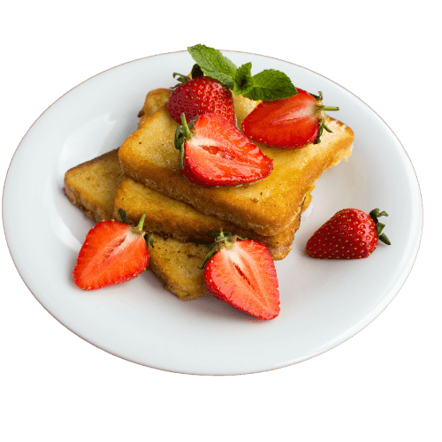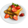 Pain perdu doré servi avec des fraises fraîches et une touche de menthe.