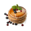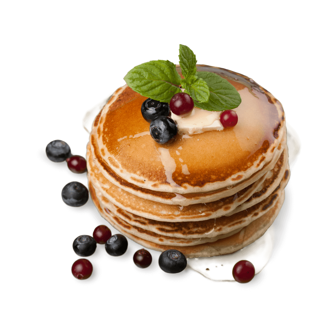 Pancakes moelleux garnis de fruits frais et d’un filet de sirop, parfaits pour le petit-déjeuner.